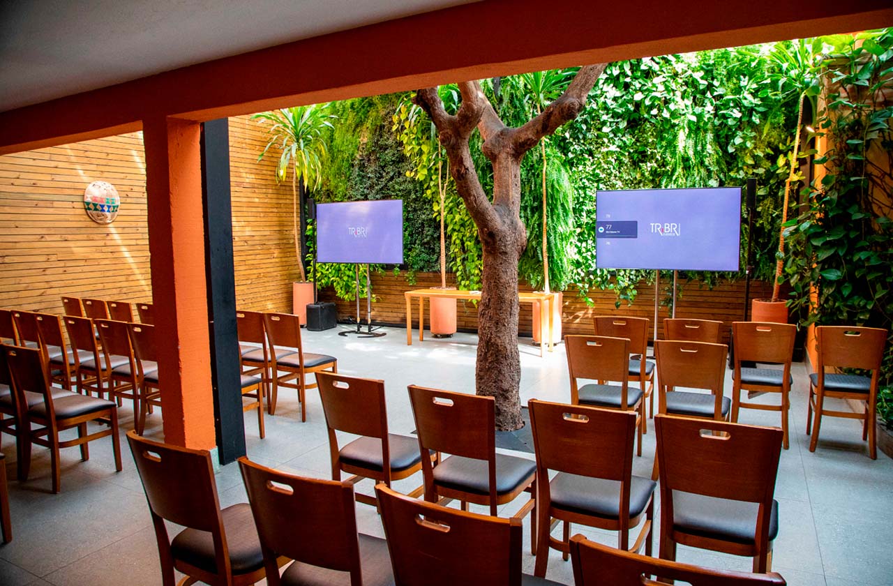Estrutura com apoio de audiovisual e sonorização profissional, ideal para talks, painéis e eventos híbridos.